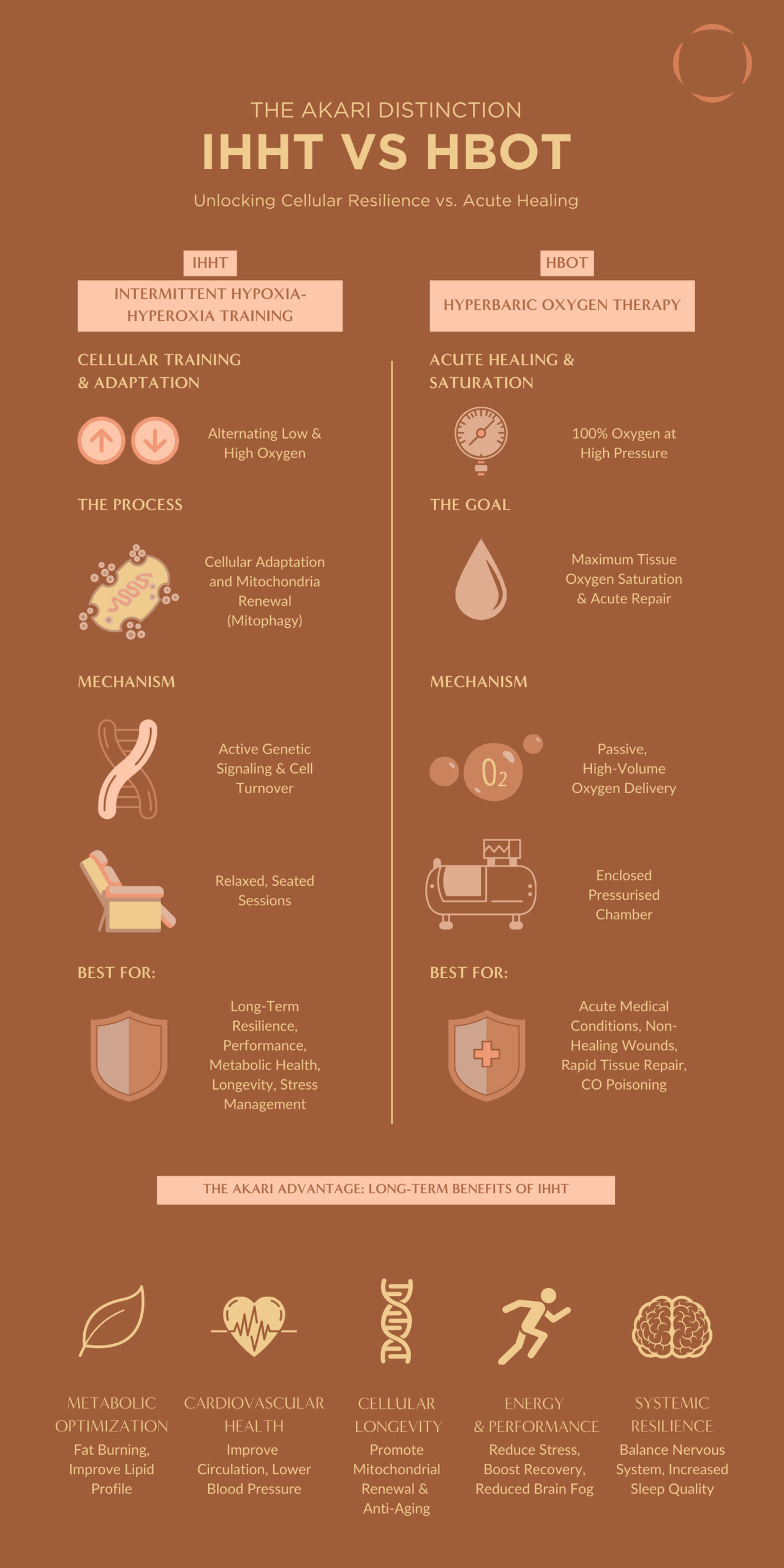 While both modalities rely on the power of oxygen, the similarity ends there. At AKARI, we understand that achieving true longevity and performance requires more than oxygen saturation, it requires cellular adaptation.